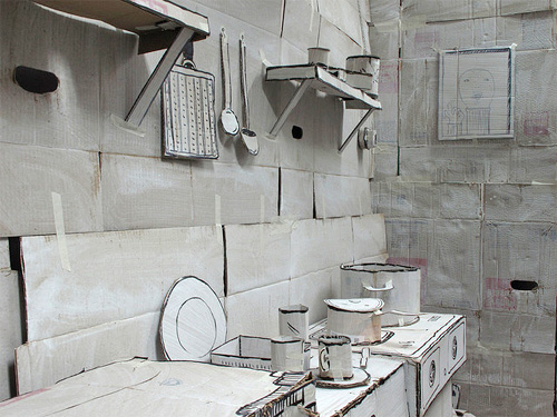 Построено все до мельчайших мелочей: тарелки, ложки, стулья, табуретки, шкафы, умывальник, электрическая плита, стены, кровать, подушки, одеяла, скейт и даже домашние тапки. Некоторые детали, правда, дорисованы черным маркером, но от этого стиль только выиграл. Отличная задумка! Причем прорисованы все мельчайшие детали, которые трудно доделать из бумаги: складки на одеяле и подушках, на занавесках, ручки на мебели, шнурки на кроссовках и т.д. Но вот практической реализации этого дома из картона я никакой не вижу. Зато красиво.